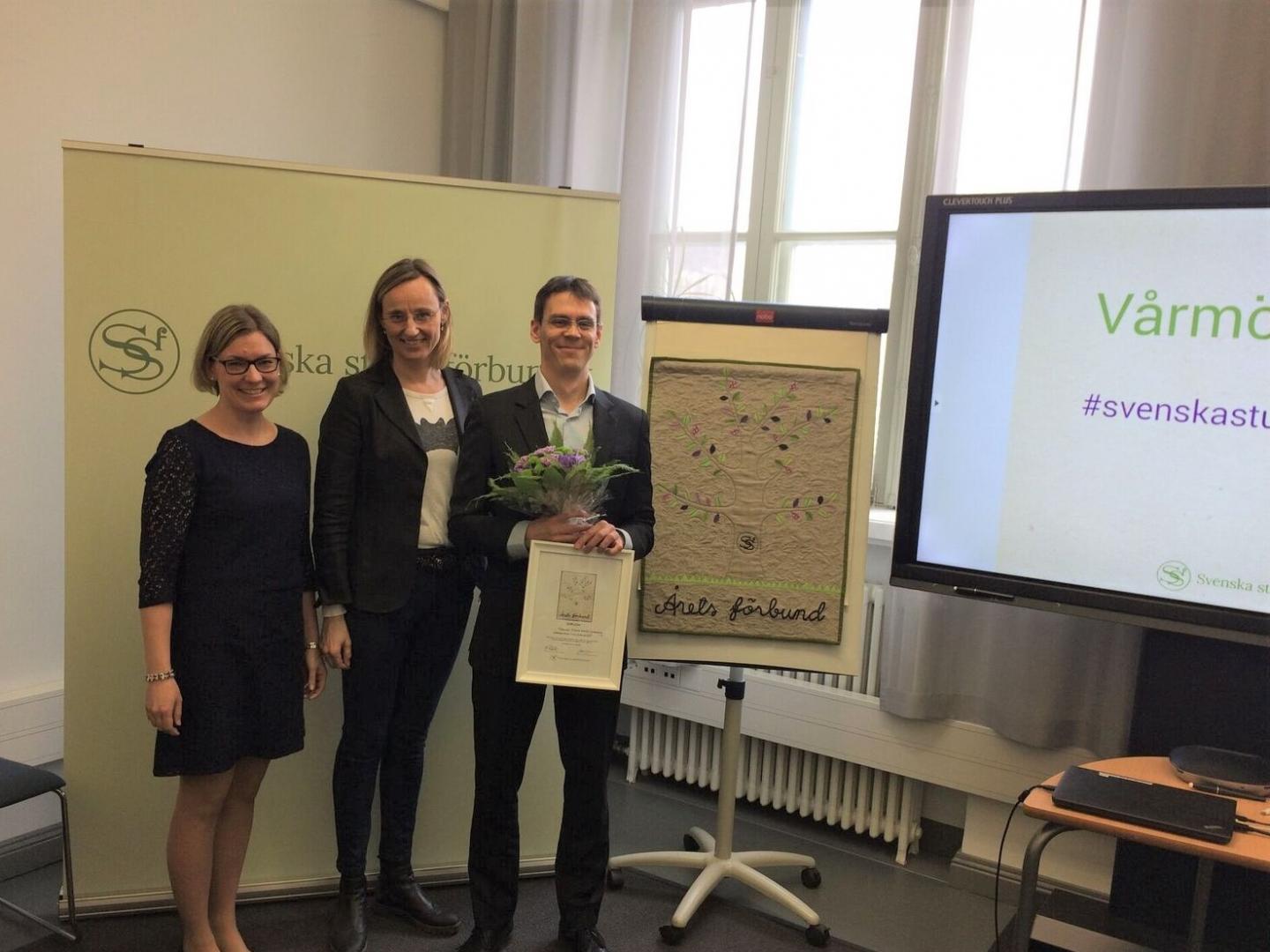 På bilden Svenska studieförbundets verksamhetsledare Mari Pennanen, ordförande Micaela Romantschuk och Förbundet Finlands Svenska Synskadades organisationsledare Matthias Jakobsson.