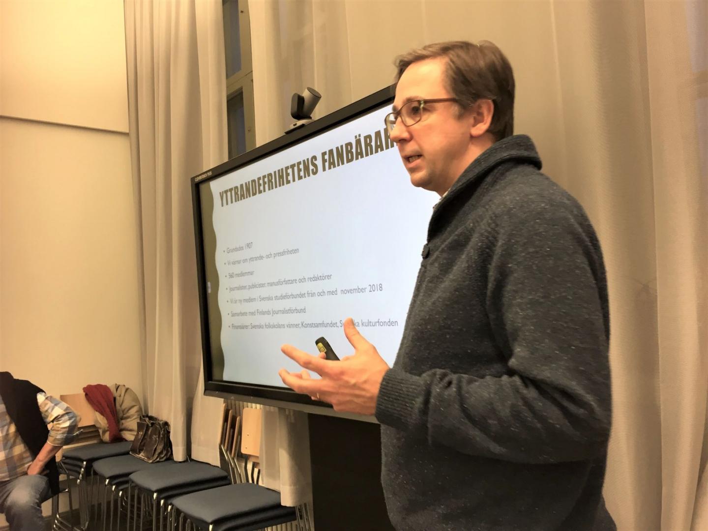 - Vi är en intresseorganisation för våra medlemmar. Till exempel frågan om presstöd är viktig för oss och vi lobbar för att i Finland i likhet med i Sverige få presstöd. Vårt mål är att värna om yttrandefriheten och en levande debatt på svenska i Finland. Vi vill främja medlemskårens yrkeskunskap och ett kollegialt förhållande mellan förbundets medlemmar, säger Mikael.
