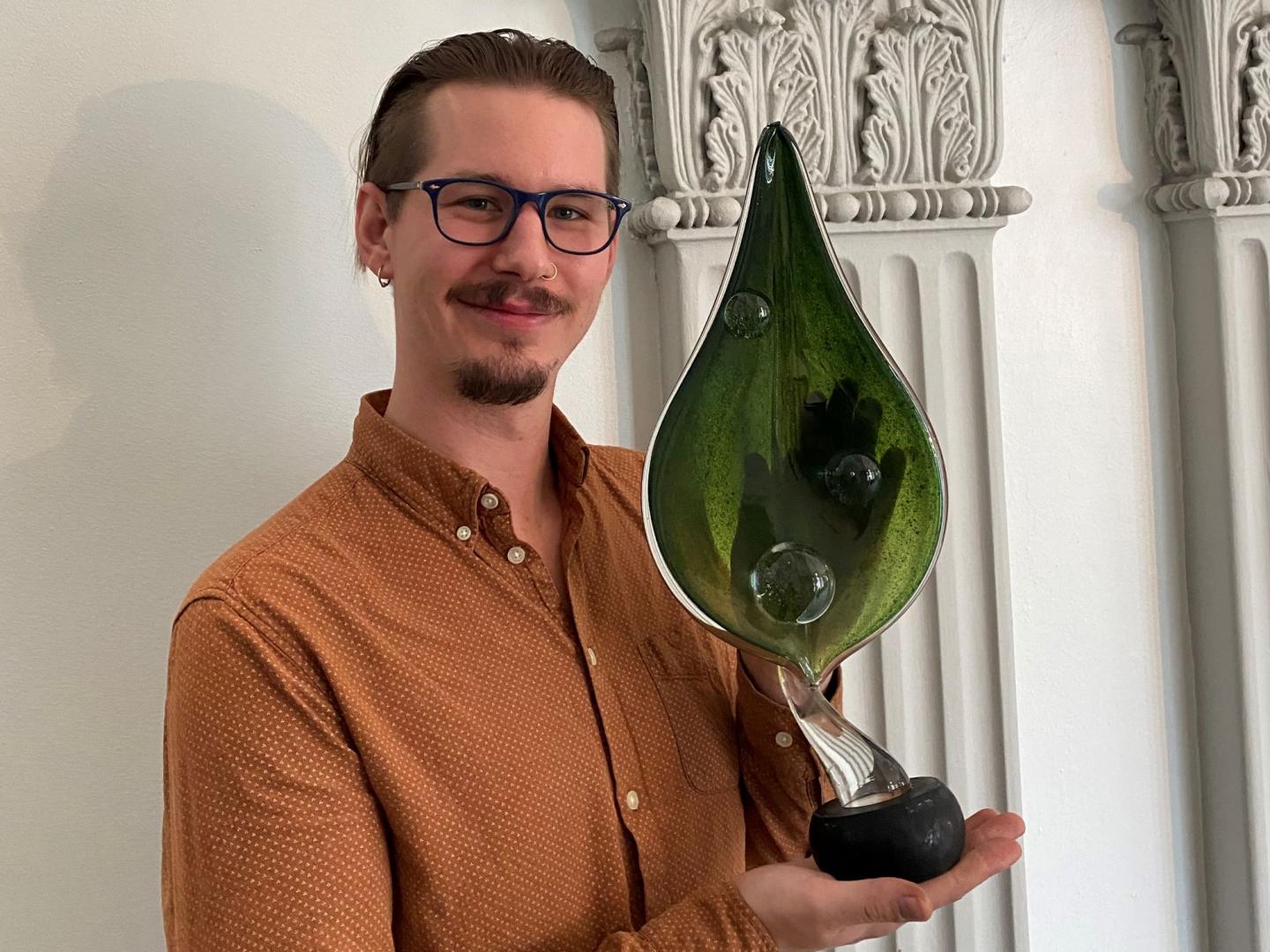 Priset som för första gången delades ut till Årets ordförande Mikaela Björklund från FDUV under Styrelsedagarna 2021 är gjort av Jarl Hohenthal.